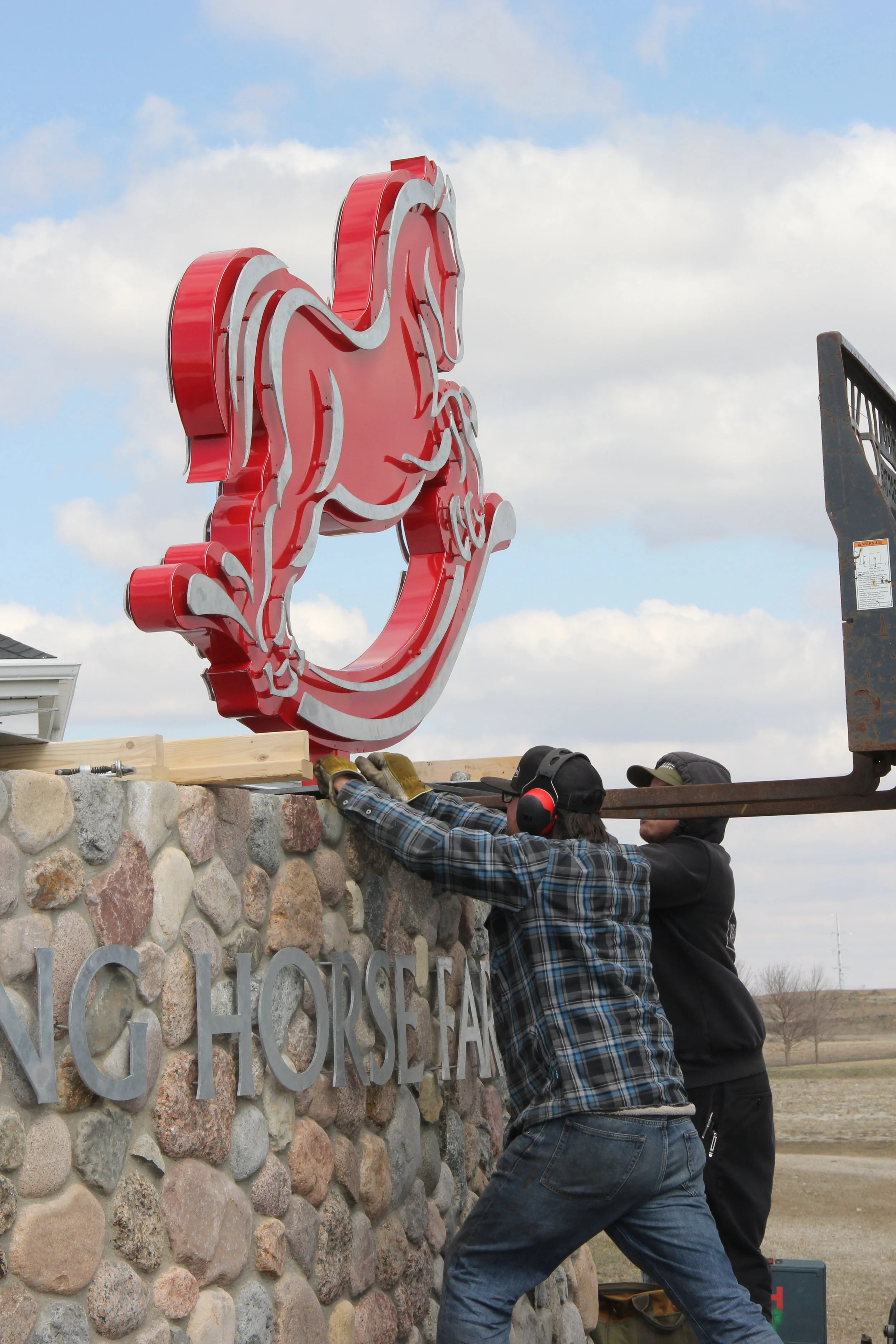 The Rocking Horse Farm entrance signage has finally been installed to welcome everyone into our community! The signage is located at the two main entrances to Rocking Horse Farm on 52nd Avenue South and Veterans Boulevard. They will be landscaped with trees and prairie grasses. At night, the entire wall and rocking horse will be lit.